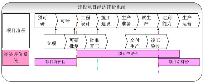 本系統(tǒng)包括項目前評估、項目中評價、項目后評價三個階段的建設項目經濟評價,貫穿了項目生命周期的各階段,實現(xiàn)對項目全生命周期的經濟評價(如圖一所示);同時系統(tǒng)具有審批流程控制、投資決策分析支持等高級功能。本系統(tǒng)不但具有強大的項目全生命周期的經濟評價測算功能,同時又具有管理與決策支持功能,滿足不同使用主體不同層次的需求。
