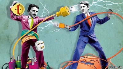 但潮流或許即將逆轉(zhuǎn)。將交流電變成直流電需要對(duì)晶體管(這是所有電子設(shè)備的心臟)供電,這種方式卻十分繁瑣,最常見的方式是借助電源適配器。這些隨處可見的小盒子現(xiàn)在已經(jīng)很廉價(jià)、很輕巧,但效率通常不高,會(huì)把電轉(zhuǎn)化成熱。而且這種設(shè)備無(wú)論晝夜、無(wú)論電價(jià)高低,都會(huì)不停地運(yùn)轉(zhuǎn)。所以,更好的方式是鋪設(shè)丹尼爾使用的那種直流電網(wǎng)絡(luò),以供所有的家用和辦公電子設(shè)備使用。