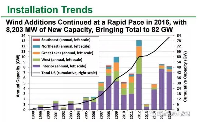 美國(guó)能源部勞倫斯-伯克利國(guó)家實(shí)驗(yàn)室日前發(fā)布最新版《風(fēng)電技術(shù)市場(chǎng)報(bào)告》,全面盤(pán)點(diǎn)美國(guó)風(fēng)電的各種數(shù)據(jù)—— 2016年美國(guó)風(fēng)電投資130億美元,新增風(fēng)電裝機(jī)8 203吉瓦(90%的新增裝機(jī)在美國(guó)中部州),占當(dāng)年各類(lèi)新增