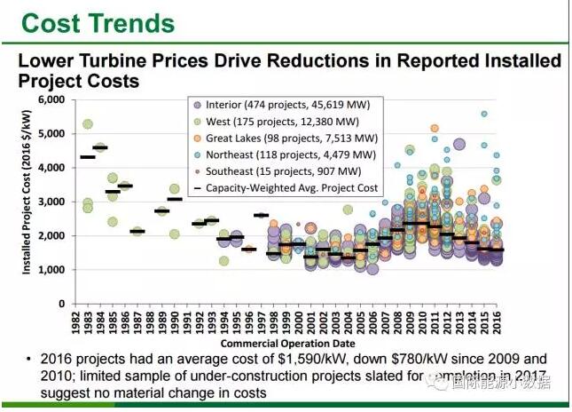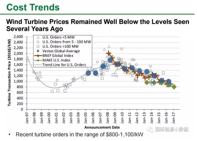# 2008年以來(lái)美國(guó)風(fēng)機(jī)價(jià)格明顯下降,目前在800-1100美元/千瓦左右。這樣,一個(gè)2兆瓦的風(fēng)機(jī)售價(jià)在160-220萬(wàn)美元之間。2016年風(fēng)電系統(tǒng)裝機(jī)成本約為1590美元/千瓦。