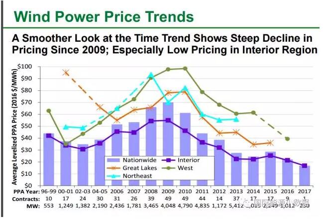 # 2009年風(fēng)電售電協(xié)議(PPA)價(jià)格平均約為70美元/兆瓦時(shí),到2016年已經(jīng)降至20美元/兆瓦時(shí);風(fēng)電已經(jīng)可與天然氣發(fā)電競(jìng)爭(zhēng)。