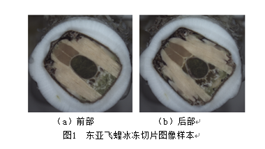 將成蟲體裝入7 mL離心管中,注入OCT包埋劑后,于液氮中速凍,制成圓柱形樣本。實(shí)驗(yàn)中采用LeiCa CM3050S冰凍切片機(jī)對(duì)樣本以25 ?m為步進(jìn)連續(xù)切片,在切片的同時(shí),用固定的數(shù)碼相機(jī)對(duì)每一切片進(jìn)行拍攝,采集切片的圖像數(shù)據(jù),建立原始圖像數(shù)據(jù)集。該數(shù)據(jù)集共計(jì)有1176張連續(xù)橫截面圖像數(shù)據(jù),總數(shù)據(jù)量約為12GB。圖1給出了東亞飛蝗冰凍切片圖像樣本。