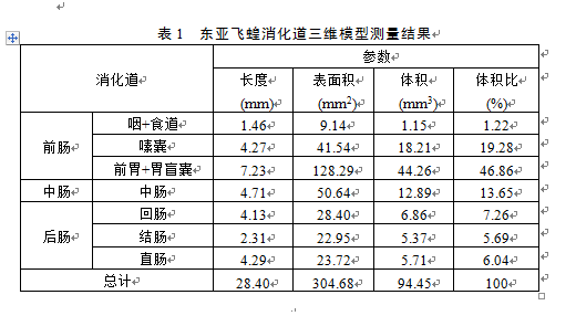 利用Imaris軟件中的3D Measurements功能,對(duì)重建后的立體圖像進(jìn)行分割,測(cè)量各段的體積、表面積和長度,獲得東亞飛蝗消化道的三維模型形態(tài)學(xué)參數(shù)。表1給出東亞飛蝗消化道三維模型的測(cè)量結(jié)果。