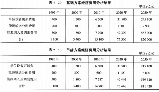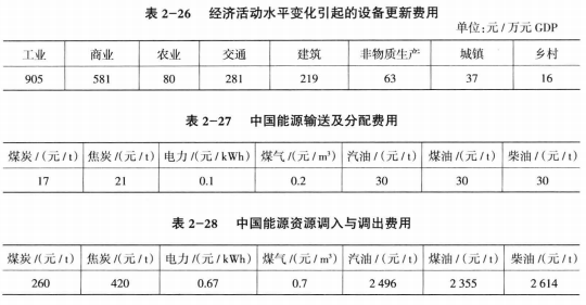 本研究進(jìn)行經(jīng)濟(jì)環(huán)境費(fèi)用分析考慮了以下及方面因素。1)計(jì)算單位活動(dòng)水平變化引起的設(shè)備更新與增加的費(fèi)用、能源節(jié)約費(fèi)用;2)能源加工轉(zhuǎn)換項(xiàng)目建設(shè)費(fèi)用及運(yùn)行費(fèi)用;3)當(dāng)?shù)啬茉促Y源費(fèi)用及能源調(diào)入費(fèi)用;4)環(huán)境污染控制費(fèi)用。表2-26,表2-27,表2-28列出的分別是中國(guó)經(jīng)濟(jì)活動(dòng)水平變化引起的設(shè)備更新與增加費(fèi)用、能源輸送分配費(fèi)用以及能源資源費(fèi)用、調(diào)入費(fèi)用等。