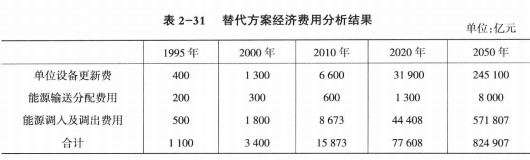 在上述經(jīng)濟(jì)環(huán)境費(fèi)用分析中,我們分別分析了能源活動(dòng)在運(yùn)行過(guò)程中引起的設(shè)備更新費(fèi)用、能源輸送及分配費(fèi)用以及本地能源資源調(diào)入與調(diào)出費(fèi)用。通過(guò)模型運(yùn)算得到了這些費(fèi)用的總費(fèi)用,其結(jié)果從表2-29,表2-30,表2-31可看出,2010年、2020年、2050年基礎(chǔ)方案總費(fèi)用分別為15 100億元、75 500億元、820000億元;節(jié)能方案分別為14 787億元、73 446億元、81 1 420億元;替代方案分別為15 873億元、77 608億元、824 907億元。