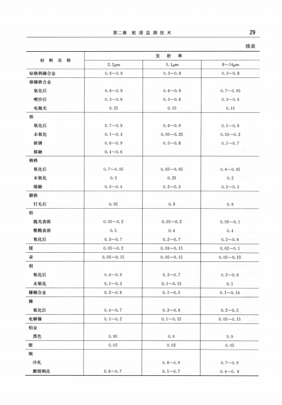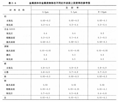 表2-6給出了金屬類(lèi)和非金屬類(lèi)物體在不同紅外波段上發(fā)射率的參考值。值得注意的是,表中的數(shù)據(jù)只是近似值,因?yàn)榘l(fā)射率還受物體表面光潔程度和溫度的影響。
