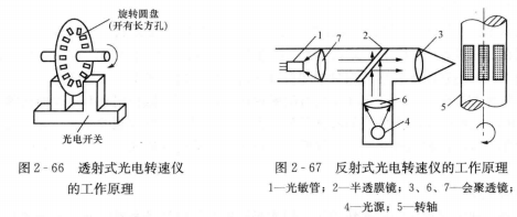 圖2-66所示為透射式光電轉(zhuǎn)速儀的工作原理。在轉(zhuǎn)動軸上安裝開有長方孔的遮光盤,該遮光盤的作用是作為光路調(diào)制器,它將連續(xù)光調(diào)制成光脈沖信號。當被測軸旋轉(zhuǎn)時,圓盤調(diào)制器使光路周期性地交替斷和通,因而使光敏元件產(chǎn)生周期性變化的電信號。顯然孔多則分辨力高。圖2-67所示為反射式光電轉(zhuǎn)速儀的工作原理,在轉(zhuǎn)動軸上涂抹黑白標記,用聚焦后的光線照射,根據(jù)反射光的強度變動次數(shù)計數(shù)。黑白條紋數(shù)多則分辨力強。
