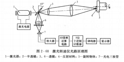 激光測轉(zhuǎn)速是激光在測量領(lǐng)域的另一個新的應用,它也是基于光電式測轉(zhuǎn)速原理,見圖2-68。氦一氖激光器發(fā)出的激光束穿過半透鏡后,透射的光束經(jīng)過由透鏡組成的光學系統(tǒng)后,聚焦在旋轉(zhuǎn)物體的表面。在旋轉(zhuǎn)物體的表面上貼有一小塊定向反射材料。當激光束照射到?jīng)]有貼反射材料的表面時,大部分激光沿空間各個方向散射,能夠沿發(fā)射光軸返回的光束極其微弱,因此光電管感受不到任何信息。一旦激光光束照射到反射材料上,由于反射材料的“定向反射”特性,有一部分激光會沿發(fā)射光軸原路返回到半透鏡上,經(jīng)過反射,由透鏡會聚到光電三極管上。于是物體每旋轉(zhuǎn)一周,反射材料就被激光照射一次,一個激光脈沖返回到光電三極管,經(jīng)轉(zhuǎn)換后產(chǎn)生一個電脈沖信號。物體不停地旋轉(zhuǎn),光電管就輸出一系列的電脈沖,這就是激光轉(zhuǎn)速傳感器所獲取的旋轉(zhuǎn)物體的轉(zhuǎn)速信息。
