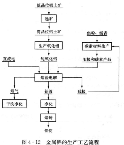 金屬鋁的生產(chǎn)包括從鋁土礦中生產(chǎn)氧化鋁和氧化鋁電解出鋁錠兩個(gè)主要過程,此法一直是生產(chǎn)金屬鋁的唯一方法。生產(chǎn)鋁的工藝流程如圖4-12所示。