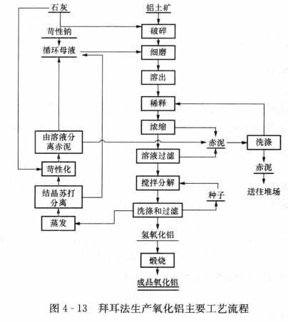 根據(jù)處理原料的不同,需要使用不同的方法提取氧化鋁,工業(yè)上使用的方法有酸法和堿法兩大類,但目前工業(yè)上幾乎全都是采用堿法,其中以拜耳法使用最廣,世界上90%的氧化鋁是用拜耳法生產(chǎn)的,其工藝流程如圖4-13所示。