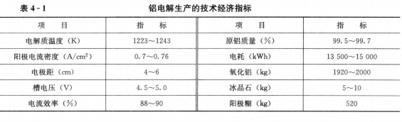 鋁的生產(chǎn)過程中,對(duì)電解質(zhì)的特性、槽電壓等參數(shù)的控制是很重要的,它直接影響到電解鋁生產(chǎn)的技術(shù)經(jīng)濟(jì)指標(biāo)。電解鋁的技術(shù)經(jīng)濟(jì)指標(biāo)見表4-1。