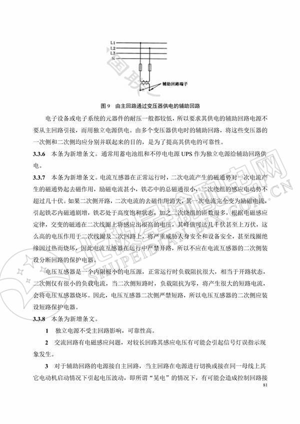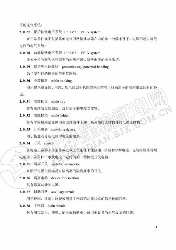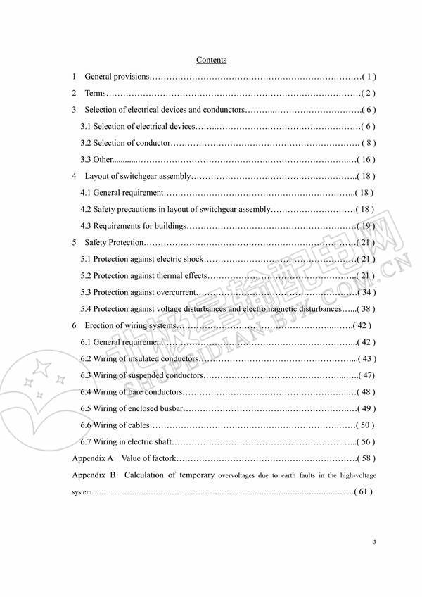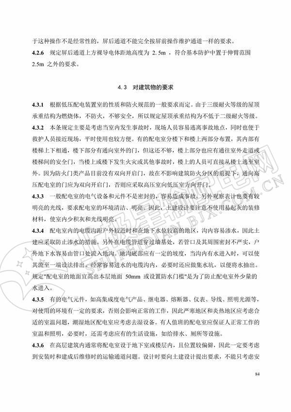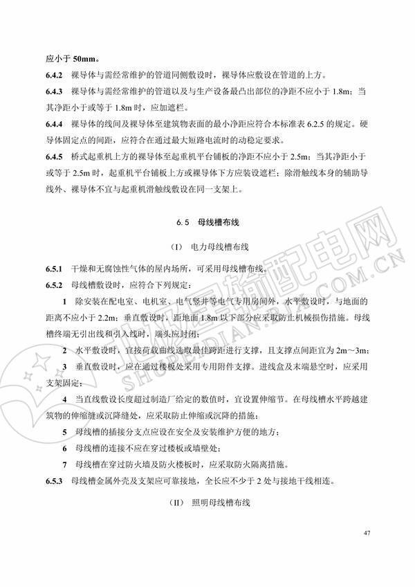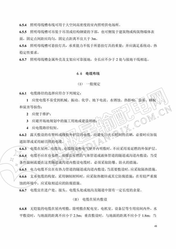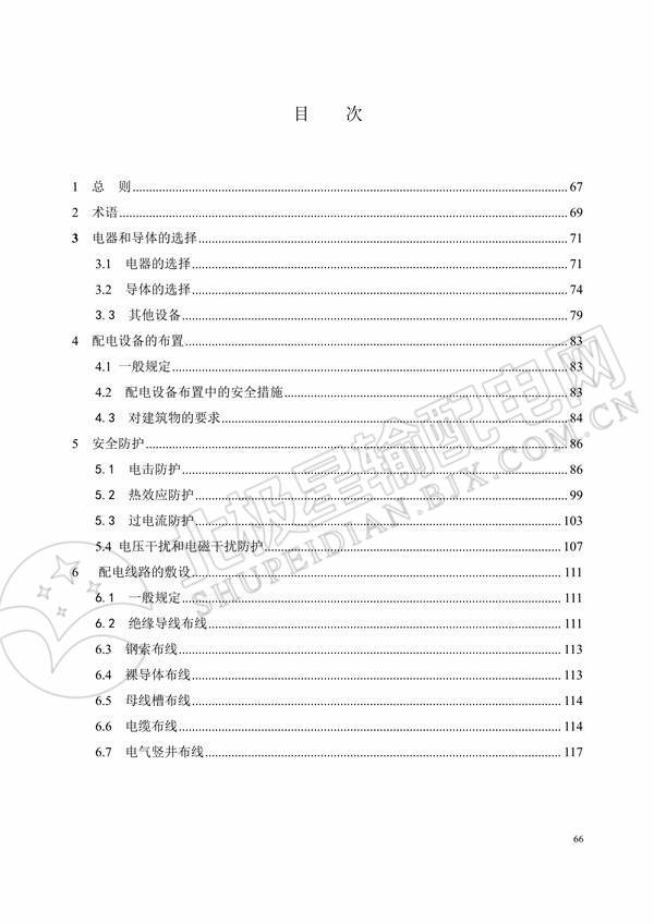 本標(biāo)準(zhǔn)共分六章和2 個(gè)附錄,主要技術(shù)內(nèi)容包括:總則、術(shù)語(yǔ)、電器和導(dǎo)體的選擇、配電裝置的布置、安全防護(hù)、配電線路的敷設(shè)等。