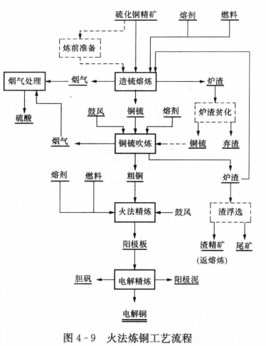 銅的冶煉可分為火法煉銅和濕法煉銅兩種,火法煉銅是當今生產(chǎn)銅的最主要方法,占銅產(chǎn)量的80%~90%,主要原料為硫化礦,其主要工藝流程如圖4-9所示。