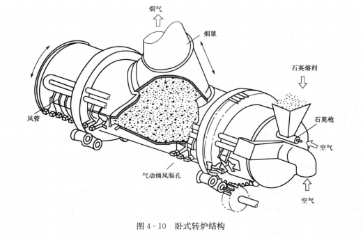 當代傳統(tǒng)成熟的吹煉技術(shù)包括臥式轉(zhuǎn)爐(P-S轉(zhuǎn)爐)吹煉、固定反射爐側(cè)式連續(xù)吹煉,國際中先進高效吹煉技術(shù)包括閃速爐吹煉、三菱法吹煉爐、奧斯麥特吹煉爐。我國大都采用臥式轉(zhuǎn)爐進行吹煉,其結(jié)構(gòu)如圖4-10所示。