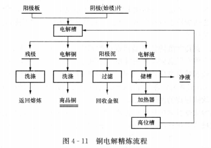 (4)陽極銅電解精煉。銅的電解精煉是在鋼筋混凝土制作的長方形電解槽中進行,槽內(nèi)襯鉛皮或聚氯乙烯塑料以防腐蝕,電解槽放置于鋼筋混凝土的橫梁上,槽子底部與橫梁之間要用瓷磚或橡膠板絕緣,相鄰兩個電解槽的側(cè)壁間有空隙,上面放瓷磚或塑料板絕緣,再放導電銅排連接陰陽極。電解精煉以火法精煉的銅為陽極,硫酸銅和硫酸水溶液為電解質(zhì),電銅為陰極,向電解槽通直流電使陽極溶解,在陰極析出更純的金屬銅的過程,如圖4-11所示。雜質(zhì)進入陽極泥或保留在電解液中,需要定期抽出電解液進行凈化。