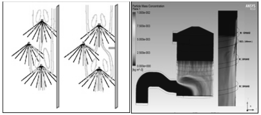 2.開發(fā)了具有氣液耦合的精細(xì)化噴淋脫硫除塵技術(shù),主要包括噴淋層精細(xì)化布置和無壁流吸收塔技術(shù),解決了塔內(nèi)氣液分布不均、同一截面氣液比不合理以及壁流等問題,避免了煙氣走廊現(xiàn)象,提高了漿液有效利用率。開發(fā)了噴淋層精細(xì)化布置技術(shù),結(jié)合噴淋脫硫原理,在不同噴淋層設(shè)計不同漿液量、噴嘴類型和霧化參數(shù)等,使每一層漿液都能有效利用,同時采用雙頭噴嘴、改善霧化參數(shù),增強(qiáng)二次霧化效果,提高SO2傳質(zhì)效果以及粉塵被液滴捕集的概率;根據(jù)煙氣流場分布特點,同一層噴淋層配置不同噴嘴密度,合理分配漿液量。