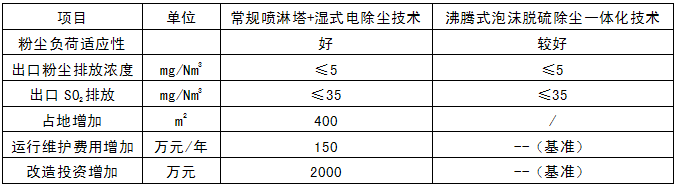 以600兆瓦機(jī)組超低排放改造為例,本技術(shù)與常規(guī)脫硫噴淋塔+濕式電除塵超低排放技術(shù)路線相比數(shù)據(jù)匯總?cè)缦拢?/p>