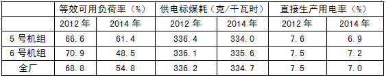 1.2014年,該廠5、6號(hào)機(jī)組的等效可用負(fù)荷率相對(duì)2012年略有下降,主要是機(jī)組調(diào)峰停運(yùn)時(shí)間和次數(shù)同比增加,但是供電標(biāo)煤耗和直接生產(chǎn)用電率同比下降。其中供電耗同比下降1.5克/千瓦時(shí)。直接生產(chǎn)用電率下降0.5%。直接廠用電率的下降主要表現(xiàn)在脫硫耗電率、電除塵耗電率及一二次風(fēng)機(jī)耗電率的下降。