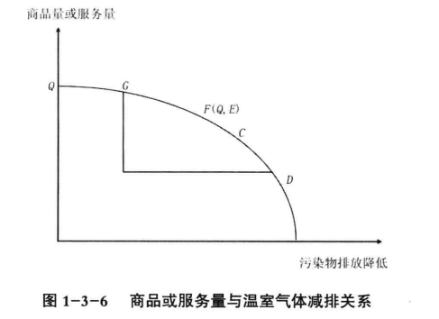 圖1-3 -6中F(Q,E)表示經(jīng)濟(jì)潛在產(chǎn)出全充滿狀態(tài)下效率有效運(yùn)行時(shí),商品或服務(wù)量與溫室氣體減排關(guān)系的理論曲線。G點(diǎn)表示經(jīng)濟(jì)潛在產(chǎn)出全充滿、效率有效運(yùn)行時(shí),有可能生產(chǎn)更多的商品,但溫室氣體減排量沒有增加;D點(diǎn)表示商品及服務(wù)量降低,溫室氣體減排量增加;C點(diǎn)表示位于G點(diǎn)與D點(diǎn)之間。