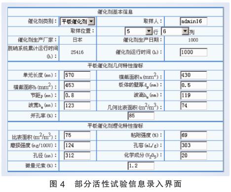 該模塊采用分類的方式登記催化劑信息.包括SCR系統(tǒng)設(shè)計信息和催化劑性能試驗信息。為嚴(yán)格標(biāo)記每次試驗.活性試驗數(shù)據(jù)錄入時需完整記錄檢測電廠名稱、機(jī)組信息、檢測次數(shù)、取樣時間、檢驗時間、預(yù)計下次檢驗日期、檢驗人員、錄人人員及審核人員。