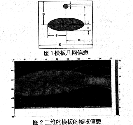 在正方形托盤上放置兩個均勻固體介質(zhì)組成的標(biāo)定模板,模板的幾何信息如圖1所示。每一點的吸收強(qiáng)度相同,模板是均勻介質(zhì)。假設(shè)探測器單元均勻分布,各探測器間距離相等,在第151次掃描結(jié)果中,第223個接收器,接收到了最弱的X射線信號,即衰減最強(qiáng)的信號。在第151次掃描結(jié)果中,此時的第223個接收器的射線與橢圓長軸重合,該時刻第278個到第168個與第74個到第46個接收器之間有效的接收到了信號,其中第278個到第168個接收器接收到的信號對應(yīng)大橢圓的短軸,短軸長度30mm,第74個到第46個接收器接收到的信號對應(yīng)小圓的半徑,半徑長度為8mm。由此可以推算出接收器的距離為0.2714mm(兩組數(shù)據(jù)平均值)。