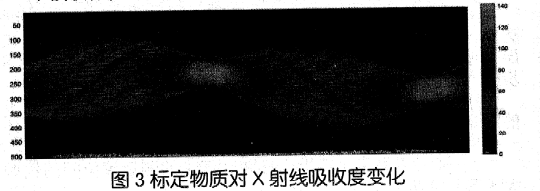 (1)系統(tǒng)使用的X射線需要照射180個方向,由于X射線的發(fā)射器和探測器相對位置固定不變,故只要求出最開始的照射角度,隨后每一次照射的角度均會隨之確定。又由于在第151次照射時,X射線與X軸平行,敝初始照射角度與X軸成29度。該結(jié)果與照射模擬結(jié)果,第1()0,200,300,400個接收器位置處的吸收信息變化相符合,結(jié)果即圖3所示。