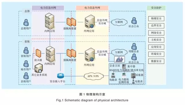 電能服務(wù)管理平臺物理架構(gòu)如圖1所示,旨在構(gòu)建兩級部署、多級應(yīng)用的物理架構(gòu)及多系統(tǒng)集成的應(yīng)用架構(gòu),基于內(nèi)外網(wǎng)混合應(yīng)用模式、打造完善的安全防護(hù)體系,實(shí)現(xiàn)平臺內(nèi)外網(wǎng)統(tǒng)一應(yīng)用。