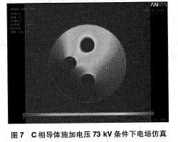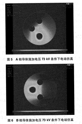 由圖4-圖7仿真分析結(jié)果可以看出,母線(xiàn)導(dǎo)體采用斜三角布置,A相導(dǎo)體位于最下部、B相位于中部、C相位于上部,A相施加73 kV電壓條件下罐體底部電場(chǎng)強(qiáng)度為5.15 kV/cm,B、C相運(yùn)行電壓下罐體底部電場(chǎng)強(qiáng)度為0.073 kV/cm及0.012 kV/cm。