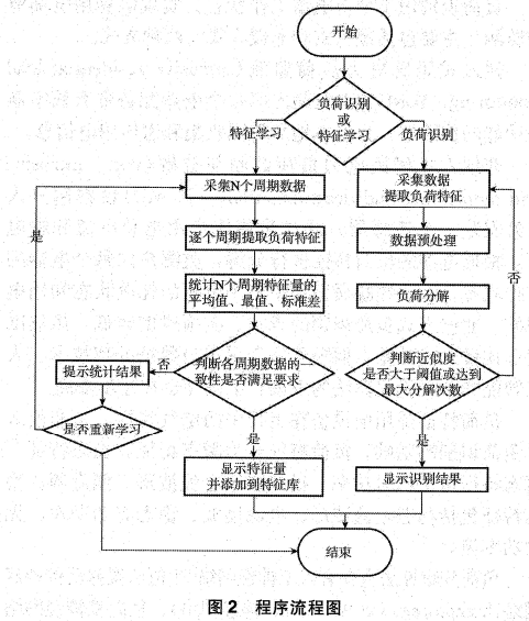 程序包括特征學(xué)習(xí)和負(fù)荷識別兩部分,流程圖如圖2所示。進(jìn)入程序后,用戶根據(jù)需要選擇工作模式,i如果采集新電器的負(fù)荷特征,選擇特征學(xué)習(xí);如果對已學(xué)習(xí)過電器進(jìn)行識別,選擇負(fù)荷識別。