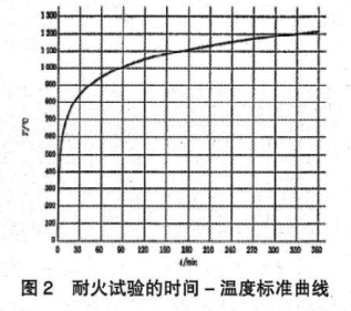 (3)耐火性能試驗(yàn)采用明火加熱,模擬試件受到實(shí)際火災(zāi)的火焰作用,全封閉燃?xì)庾詣?dòng)加熱爐滿足以下溫升條件:T=3451g(Rt+1)+20,式中,t表示試驗(yàn)所進(jìn)行的時(shí)間,單位為nun;T表示升溫到t時(shí)間時(shí)爐內(nèi)平均溫度,單位為℃。上述函數(shù)曲線為時(shí)間·溫度標(biāo)準(zhǔn)曲線,如圖2所示。耐火試驗(yàn)時(shí),以時(shí)間間隔不超過1min測(cè)量不記錄溫度值1次。30min時(shí)試驗(yàn)爐內(nèi)溫度這到B42℃,60min時(shí)試驗(yàn)爐內(nèi)溫度達(dá)到945℃。