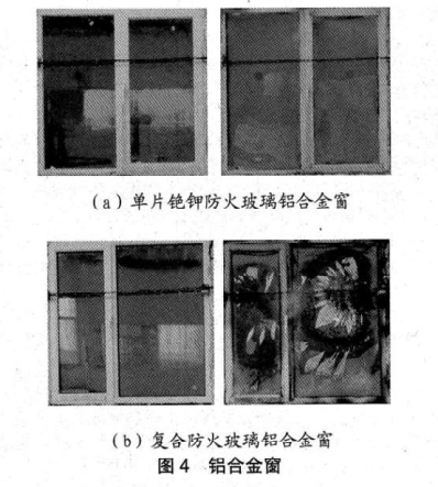 為滿足耐火完整性要求,鋁合金窗玻璃結(jié)構(gòu)中至少包含一層防火玻璃,防火玻璃按結(jié)構(gòu)可分為單片防火玻璃和復(fù)合防火玻璃。目前國內(nèi)常見單片防火玻璃主要為單片銫鉀防火玻璃:是指普通玻璃通過特殊化學(xué)處理在高溫狀態(tài)下進(jìn)行離子交換,加入了銫鉀等離子,同時(shí)通過物理鋼化處理,提高了玻璃的抗沖擊強(qiáng)度同;另外,一些企業(yè)為應(yīng)付檢查,采用高硼硅玻璃、微晶玻璃等制成特種防火玻璃,也屬于單片防火玻璃,但在工程上應(yīng)用較少。常見復(fù)合防火玻璃是指在兩片玻璃之間加上一層透明且具有阻燃性能的凝膠,凝膠遇到高溫時(shí)會(huì)發(fā)生吸熱分解反應(yīng),變?yōu)椴煌该?,有阻隔火焰的能力,目前國?nèi)主要采用海綿硅防火玻璃。不同防火玻璃結(jié)構(gòu)的鋁合金窗試驗(yàn)照片如圖4所示。