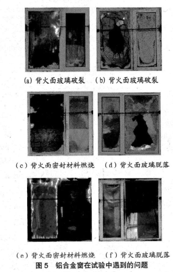 (4)鋁合盒窗玻璃壓條有問題:在耐火試驗(yàn)過程中,爐內(nèi)達(dá)較高的溫度,壓條軟化脫落,導(dǎo)致玻璃脫落,如圖5(e)所示。