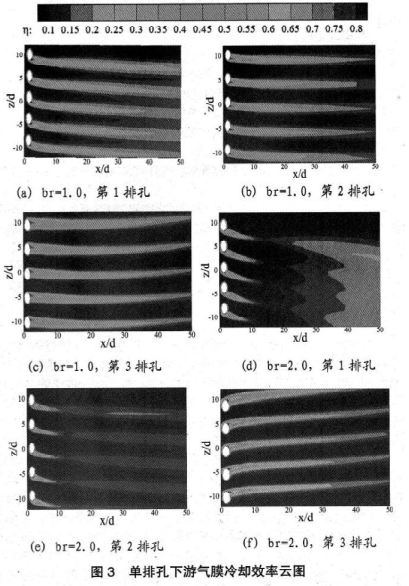 吹風比的大小代表了冷氣穿透主流邊界層進入主流核心區(qū)的能力。圖3為單排孔在bf=1.0和br=2.0時的氣膜冷卻效率云圖。從圖中可以看出在同一吹風比下,第1排孔展向擴散特性最好?;鲃臃较?,第1排扎在下游實現(xiàn)了氣膜全覆蓋,第2和第3排孔下游一直存在冷卻死區(qū)。隨著吹風比的增大,冷氣在展向偏移更加明顯。
