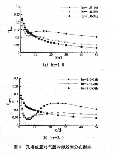 圖4給出了在吹風比為1.0和2.0時,所對應的孔下游氣膜冷卻效率隨x/d的變化情況。圖4(a)是在br=l.0時,x/d<7,第3排孔冷卻效率最高,因為第3排孔孔徑最大且孔間距最小,同樣的吹風比下,能更好的實現(xiàn)氣膜覆蓋。x/d>10時,第1排孔冷卻效率最高。第3排孔冷卻效率最低,這是因為第1排孔離滯止線最遠,第3排孔離滯止線最近。當氣膜孔位置后移時,所對應的主流區(qū)的速度也變大,相對減弱了吹風比的影響。圖4(b)是br2=0時,第1,2,3排孔展向平均氣膜冷卻效率隨x/d的變化。x/d<12時,第3排孔的冷卻效率最高,這說明吹風比增大,會加強孔徑和孔間距對氣膜冷卻效率的影響。5 4結(jié)論 (1)在氣膜孔下游同一位置,隨著吹風比增加,氣腆冷卻效率降低。 (2)氣膜冷卻效率沿流向先下降然后上升,在氣膜孔下游較遠距離再次下降。 (3)低吹風比時,氣膜孔排距離滯止線越遠,冷氣在展向擴散性越好,氣膜冷卻效率越高。高吹風此時,孔排距離滯止線越近,冷氣的展向擴散性沿流向由差變好。 參考文獻: [1]Lu Y P,akkad S V,Bunker R S.Trench film eoolin8: effectof tr6nch downstteam edge and hole spacinZfRl.ASME PanerGT2008-50606, 2008. [2]Mtck W J,Mayle R E.Stagnation film cooling and heattransfer including it 8 effect wlthin the hale patternIJl,ASNtE Journal of Turbomachinery,1988,ll0(01): 66-72, [3]M Ehendale^B,Han J C.Influenee of high mainstreamturbulence on IeadinZ edge film eooling heat transferr[Rl.ASME 902GT29,1990. [4]Martinez R F,Yuen C H N.Measurement of local heat transfercoaffieient, and film coolinS effectiveness through discreEeholes [CJ. ASME Confetence Proceedings, 2000-GT-0243, 2000. [5]李廣超,朱惠人,白江濤等.氣膜孔布局時前緣氣膜冷卻效率影響的實驗[J]。推進技術(shù),2008, 29(02):153-:157. [6] 李少華,張玲,朱勵等。渦輪葉片前緣氣膜冷卻的流線分析[J].中圍電機工程學報,2010, 30 (14): 96-101. [7]戴萍,林楓.透平葉片前緣氣腱冷卻數(shù)值模擬[J].航空動力學報,2009,“(03): 519-525. [8]雷云濤,林智榮,袁新,透平葉片前緣雙排變錯孔氣膜冷卻數(shù)值模擬[J].清年天學學報:自然科學版.2010, 30(20):1843-124/.基金項目:國家自然科學基金( 51406124)遼寧省自然科學基金( 201602576) 作者簡介:田佳(1991-),男,山西朔州人,碩士研究生,主要研究方向:燃氣輪機氣動熱力學。