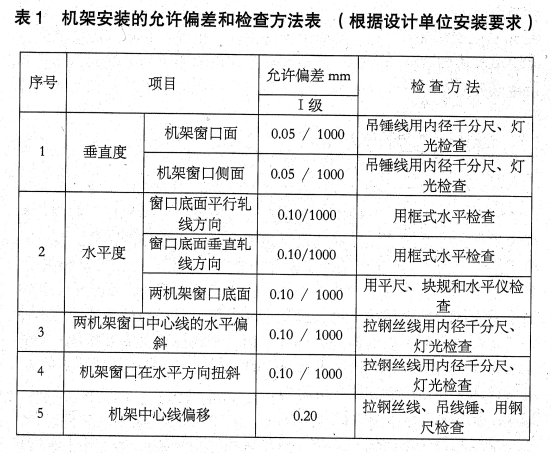 機(jī)架就位后將入口側(cè)底座向出口側(cè)靠緊(靠緊時(shí)先將出口側(cè)底座用臨時(shí)支撐住,同時(shí)用百分表監(jiān)測(cè)出口側(cè)底板是否有位移),用0.05mm塞尺檢查機(jī)架與底座結(jié)合面的接觸間隙,四周部位75%不入,同時(shí)局部間隙應(yīng)小于0.10mm。機(jī)架縱橫中心線的檢查,應(yīng)以機(jī)架窗口中心線為基準(zhǔn),垂直度,水平度等偏差尺寸應(yīng)符合設(shè)計(jì)技術(shù)文件的規(guī)定,其檢測(cè)方法如表1。