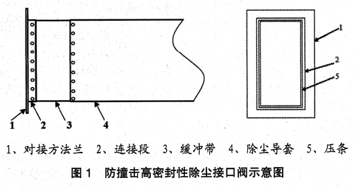 對接方法蘭1用鋼板制成,一端為對接平面,另一端通過連接段2與緩沖帶3連接,用壓條5固定連接;所述緩沖帶3由帶線層的皮帶制成,一端與方法蘭1連接,另一端與活動導套4連接,連接方式為螺栓連接,便于更換;所述除塵導套4用鋼板制成,由液壓頂桿驅動頂出,完成接口閥與除塵管道的對接。改造后結構簡單、工作可靠、制造成本低、維修方便、避免了因撞擊對除塵裝囂造成損壞,起到保護除塵裝置和提高接口窯封性的作用。