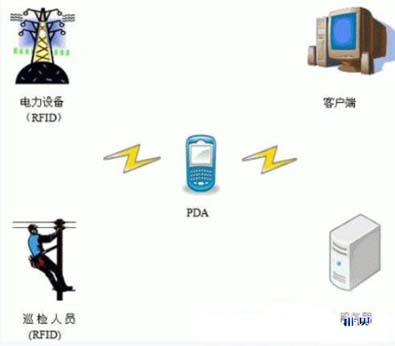基于上述構(gòu)架而設(shè)計(jì)的智能電網(wǎng)的系統(tǒng)結(jié)構(gòu)圖如圖2所示,其中電力設(shè)備與巡檢人員及覆蓋在其上的電子標(biāo)簽屬于感知層,PDA手持計(jì)算設(shè)備屬于解析層,客戶端PC與服務(wù)器對應(yīng)系統(tǒng)的應(yīng)用層和數(shù)據(jù)層。