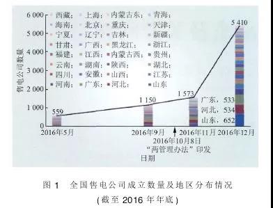 隨著電力體制改革的推進,各方參與售電市場積極性較高,各地陸續(xù)成立售電公司。根據(jù)“全國工商局企業(yè)信用信息公示系統(tǒng)”逐省統(tǒng)計,截至2016年底,全國已有5 410家從事售電的公司。全國售電公司成立數(shù)量及地區(qū)分布情況見圖1。