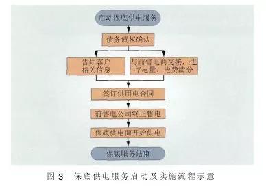 對于前兩類,主要由保底供電商(電網(wǎng)企業(yè)或配電網(wǎng)運營者)按政府核定價格供電。對于第3類用戶,當售電公司無法為其提供售電服務(wù)時,按照《有序放開配電網(wǎng)業(yè)務(wù)管理辦法》,要求配電網(wǎng)運營者直接啟動保底供電服務(wù)。保底供電服務(wù)流程目前尚不清晰,參照國外實踐經(jīng)驗,建議保底供電服務(wù)實施流程如下:保底供電商啟動保底供電服務(wù),告知用戶相關(guān)信息,與原售電公司進行交接,進行電量、電費清分;征得用戶同意后簽訂供用電合同,原售電公司與用戶簽訂合同隨之中止;保底供電商按政府核定價格進行保底供電。當用戶選擇其他售電公司,辦理完相關(guān)更換程序后,保底供電服務(wù)終比。具體流程如圖3所示。