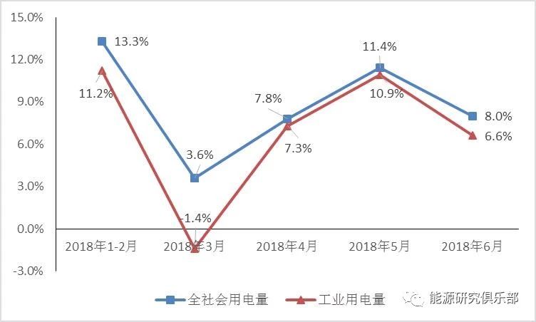 1~2月和5月用電量同比增速創(chuàng)下8年新高。分月看,1~2月用電量增速最快,主要是由于年初“冷冬”導致取暖負荷增加較大,且電能替代效果顯著、各地“煤改電”工程進展速度較快增加了冬季的電力消費;3月用電量增速大幅下降,主要是由于今年春節(jié)較晚、企業(yè)庫存偏高,且受到環(huán)保督查的影響不少企業(yè)處于停工狀態(tài),工業(yè)生產(chǎn)較慢,3月規(guī)模以上工業(yè)增加值同比增長6.0%,為去年9月以來最低,導致工業(yè)用電量同比下降;4月和5月,經(jīng)過環(huán)保督查和冬季停工,工業(yè)生產(chǎn)普遍恢復,加上持續(xù)高溫天氣的影響,5月全社會用電量同比增長11.4%,創(chuàng)下近8年來同期新高;進入6月后南方區(qū)域降雨增多,用電量增速環(huán)比小幅回落3.4個百分點。