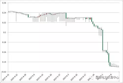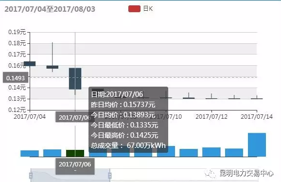 上圖就是昆明電力交易中心發(fā)布的2017年7月3日至8月2日的日前電量交易K線圖了,圖中的昨日均價(jià)、今日均價(jià)、今日最高價(jià)、今日最低價(jià)分別與股市及期貨市場(chǎng)中的開(kāi)盤價(jià)、收盤價(jià)、最高價(jià)、最低價(jià)對(duì)應(yīng)。嗯,是的,你沒(méi)有看錯(cuò),在7月6日,云南電力市場(chǎng)日前電量交易成交了67萬(wàn)千瓦時(shí),最高成交價(jià)每千瓦時(shí)0.1425元,最低成交價(jià)每千瓦時(shí)0.1335元,平均成交價(jià)為每千瓦時(shí)0.13893元,較7月5日每千瓦時(shí)下降1.8分,這充分說(shuō)明市場(chǎng)博弈相(xun)當(dāng)(qi)激(lai)烈(le)。