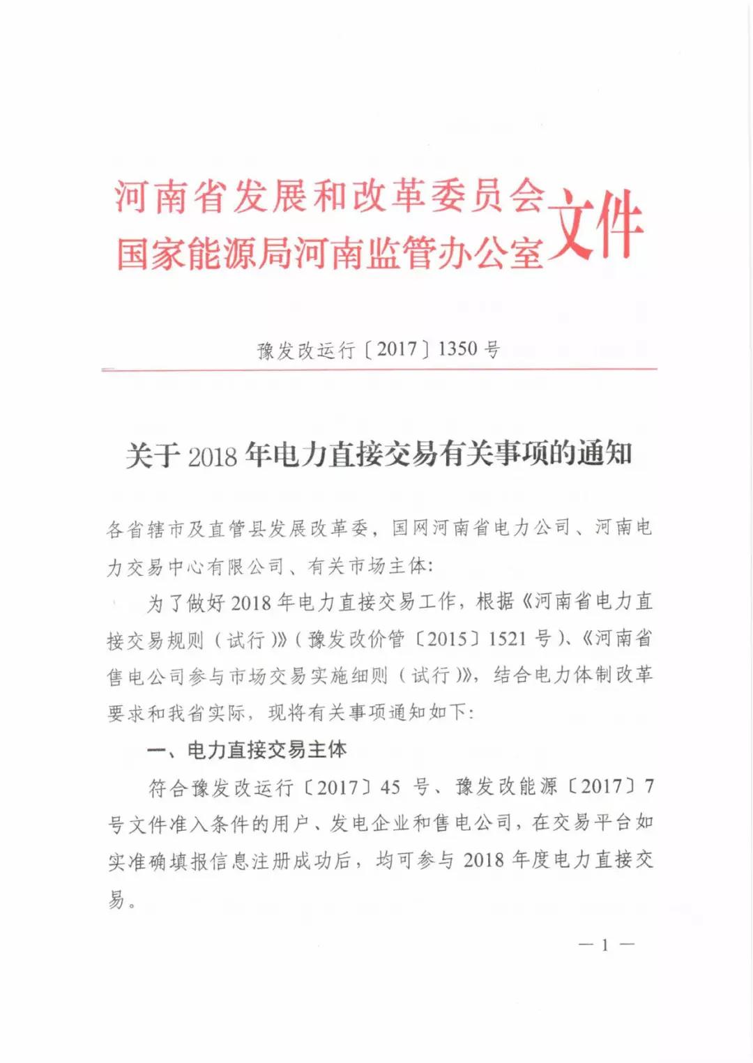 河南發(fā)改委、河南能監(jiān)辦日前聯(lián)合發(fā)布了《關于2018年電力直接交易有關事項的通知》。2018年電力直接交易采取年度雙邊協(xié)商交易、月度集中撮合交易兩種交易方式。