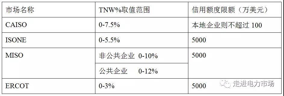 市場主體的信用評分必須不低于50分,才有對應(yīng)的無抵押信用額度,否則無抵押信用額度為零。并且PJM還對不同信用等級的主體設(shè)置了不同的無抵押信用額度限額,最多不得超過5000萬美元。不同的電力市場的TNW%取值是不一樣的,對于給出無抵押信用額度限額的市場,F(xiàn)ERC要求所有電力市場的無抵押信用限額都不得超過5000萬美元。北美幾個主要電力市場的無抵押信用額度限額如表2所示。