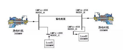 以簡單的4節(jié)點系統(tǒng)為例:熱電#1機(jī)、熱電#2機(jī)最大發(fā)電能力分別為300MW和500MW;NODE_A與NODE_B之間存在輸電阻塞;LMP_a= LMP_c =400;LMP_b= LMP_d =450;