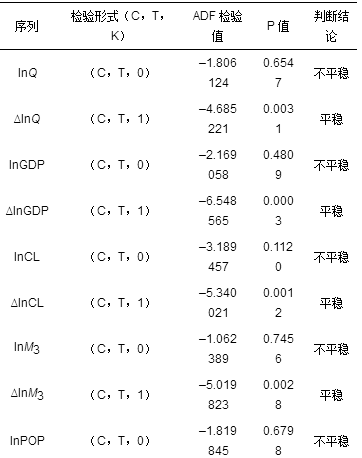 在構(gòu)建電力需求與經(jīng)濟(jì)社會(huì)發(fā)展指標(biāo)之間的長(zhǎng)期均衡關(guān)系模型時(shí),首先需要對(duì)各變量進(jìn)行平穩(wěn)性檢驗(yàn)。為消除數(shù)據(jù)的異方差性,對(duì)Q、GDP、GDP3、GDPg、POP以及CL等變量直接取對(duì)數(shù)后進(jìn)行平穩(wěn)性檢驗(yàn),CITY、M3和Mg分別乘以100后再取對(duì)數(shù)。各變量檢驗(yàn)結(jié)果如表2所示。