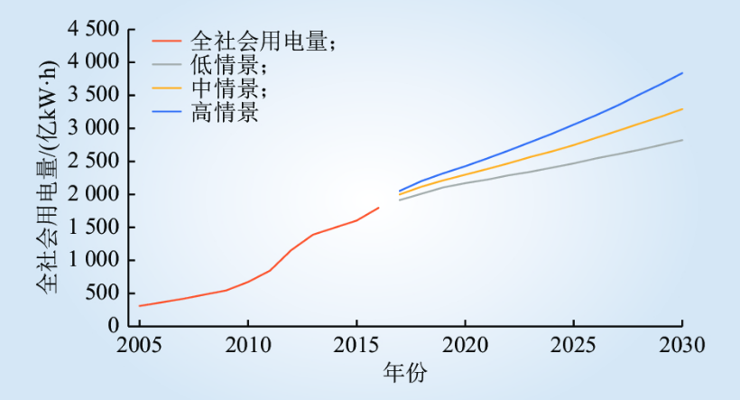 圖 2 2017—2030年新疆全社會(huì)用電量分情景預(yù)測(cè)