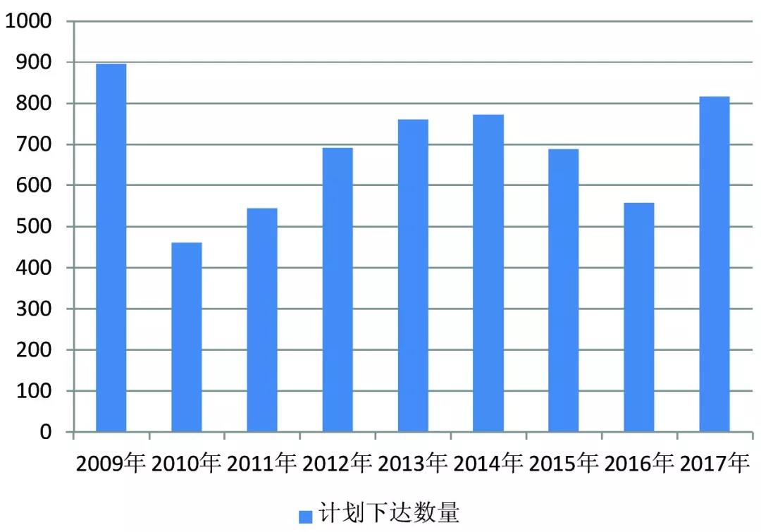 圖1 能源領(lǐng)域行業(yè)標(biāo)準(zhǔn)計(jì)劃項(xiàng)目(除核電)下達(dá)數(shù)量年度統(tǒng)計(jì)