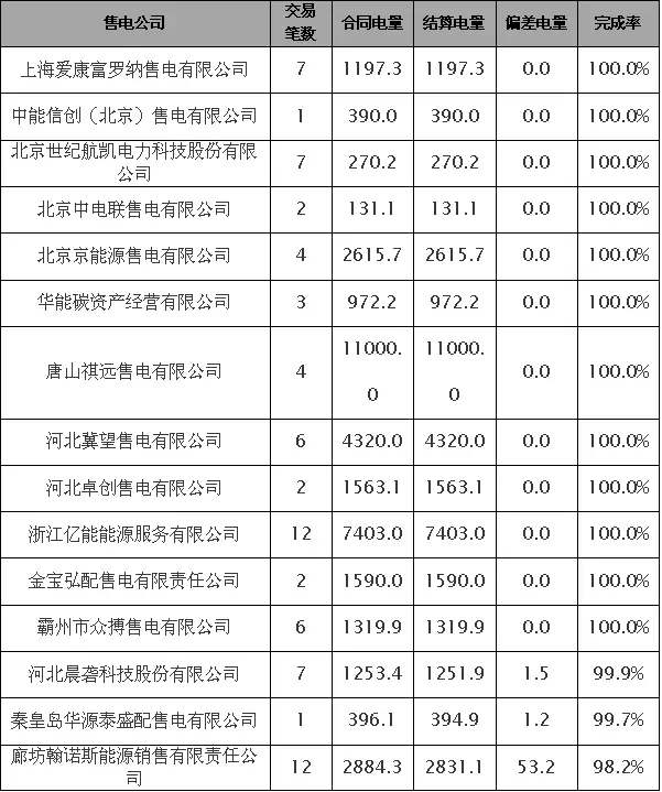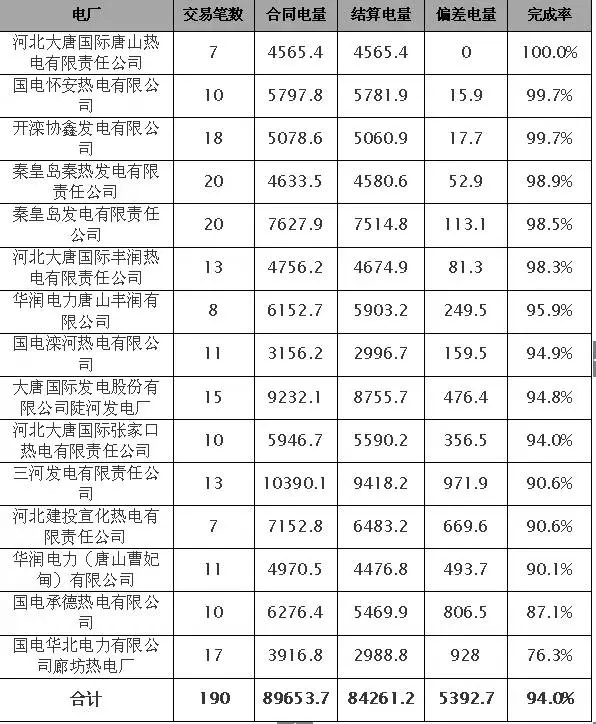 15家冀北統(tǒng)調(diào)電廠參與直接交易,合同電量8.97億千瓦時(shí),實(shí)際結(jié)算電量8.43億千瓦時(shí),完成率約94.0%。