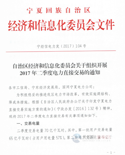 日前,寧夏回族自治區(qū)經(jīng)濟和信息化委員會發(fā)布了關于組織開展2017年二季度電力直接交易的通知,二季度交易電量70億千瓦時。其中,第一批用戶交易電量65億千瓦時,第二批用戶交易電量5億千瓦時。詳情如下:關于發(fā)布