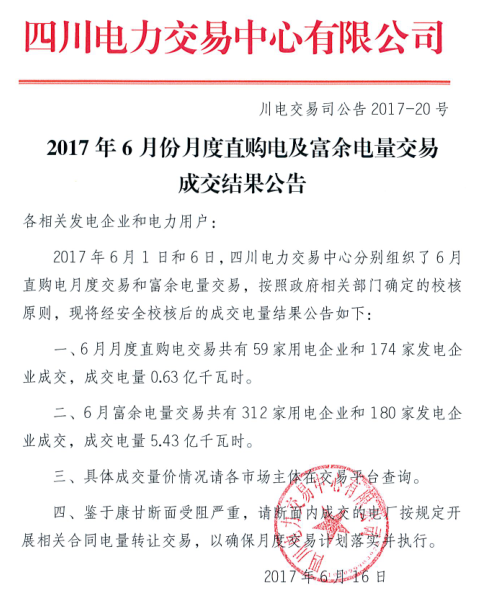 四川6月月度交易結(jié)果出爐 共成交6.06億千瓦時